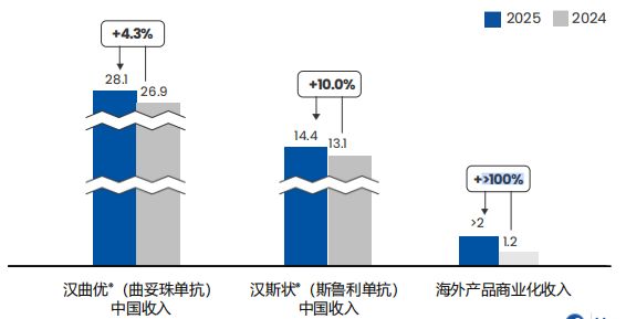 未来两年开始,降低成熟产品在中国的预期2025年,复宏汉霖的产品总收入约57.75亿元,同比增长17.0%。其中,HER2单抗药物曲妥珠单抗(商品名:汉曲优)仍是公司的现金牛产品,在国内的收入同比增长4.3%,达到28.09亿元,其在欧盟、美国获批的同款产品Zercepac和Hercessi销售合计1.55亿元。