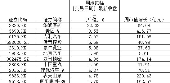 成分股方面,华润医药本周表现抢眼,周涨幅超过20%,美团-W、吉利汽车、传音控股、蒙牛乳业本周涨幅也均超过5%。周市值增长方面,美团-W、农夫山泉、紫金矿业、比亚迪本周市值增长均超过200亿元。