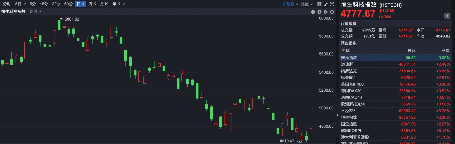 恒生科技指数开盘报4777.67点,上涨127.85点,涨幅2.75%。