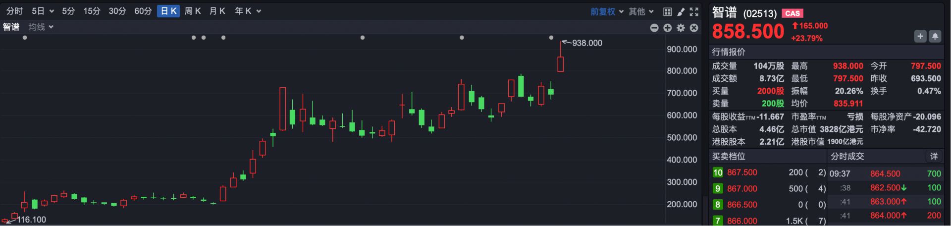 AI概念股再度全线走强,智谱涨超24%,盘中创下938港元上市以来新高。此外,迅策涨近10%,Minimax涨近9%,股价重上1000港元大关。
