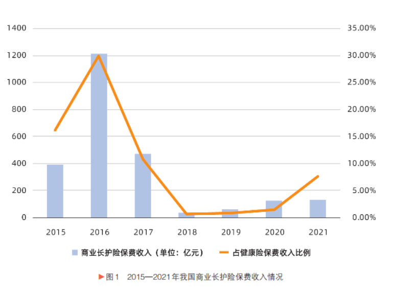 根据《上海保险》2024年第12期《我国商业长期护理保险实践研究》(下称《实践研究》)所载,我国商业长护险在健康险中占比偏低、发展滞后。尽管曾在人身险费率市场化改革阶段迎来高速增长(2016年保费达1208 亿元,占健康险近 30%),但不少产品偏离保障本质。2017年监管新规规范产品设计,行业随即大幅调整,2018年商业长护险保费在健康险中占比降至0.7%。而近年来,伴随老龄化加剧与政策鼓励,商业长护险逐步回暖,2021年保费回升至132亿元。
