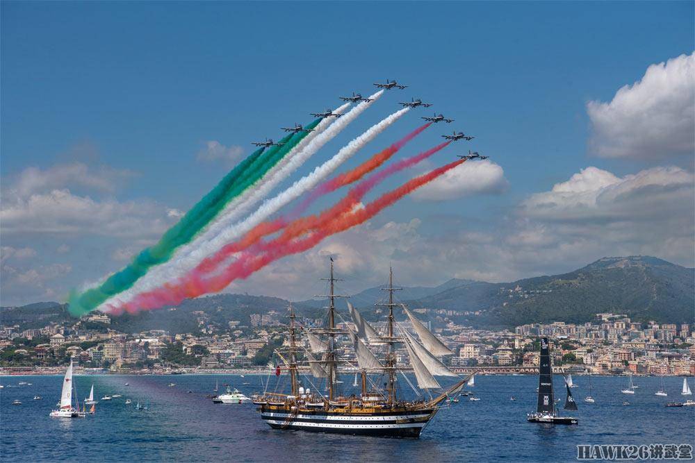 意大利空军“三色箭”飞行表演队拉出国旗色彩烟飞越海湾,庆祝意大利空军建立103周年,海湾内还有一艘意大利海军的风帆训练舰。20世纪初,意大利绝对是航空大国,也是最早将飞机用于战争的国家,史上首次空中侦察和空中轰炸都是由意大利在1911年的意土战争中创造的。在墨索里尼的主张下,意大利在1923年成立了独立的空军,当时意大利还是君主制,所以称为意大利皇家空军(Regia Aeronautica Italiana)。