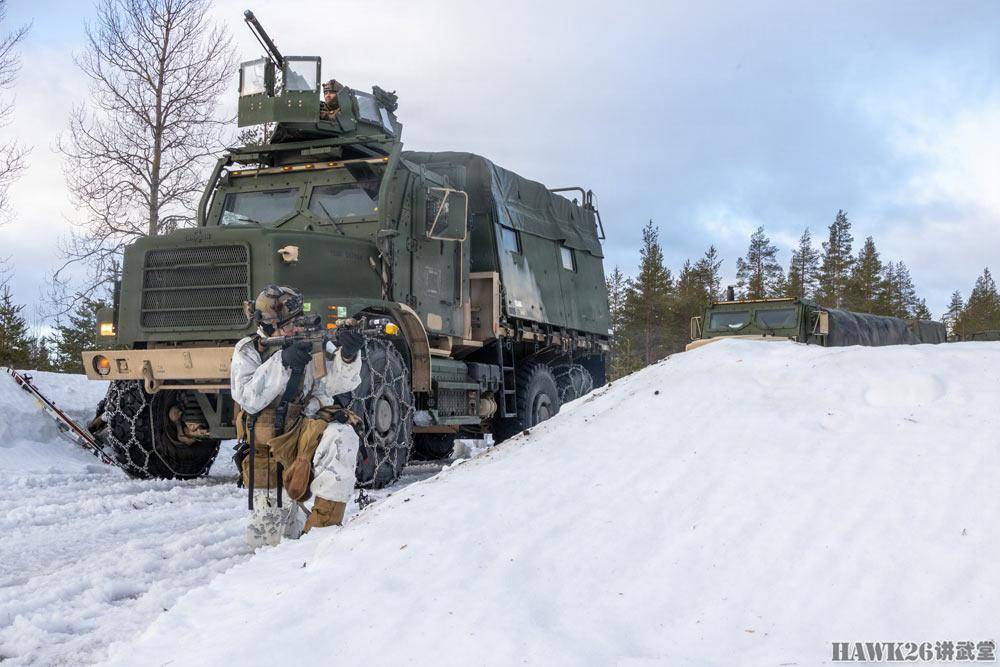 参加“寒冷反应(Cold Response)”演习的美国海军陆战队第2陆战师第6陆战团第2营执行战斗勤务支援任务,为其他部队提供后勤补给和重型摩托化武器支援。可以看到军用卡车货厢两侧覆盖带防弹玻璃的钢板,为运输的物资和人员提供保护。装甲驾驶舱顶部的旋转枪塔还可以提供火力掩护,保护运输车队的安全。