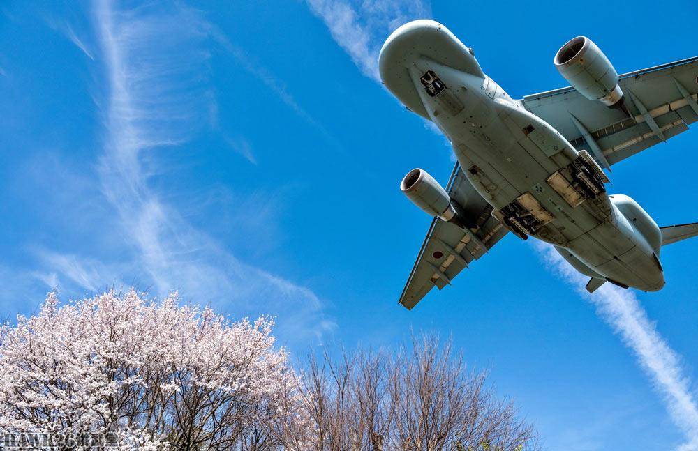3月24日,日本航空自卫队EC-2电子战机进行第二次试飞。此时,樱花已经盛开,飞越樱花树的EC-2构成了这幅漂亮的照片。拍摄时,EC-2已经放下起落架准备着陆。从这个角度可以明显看到,机鼻和机身后部两侧夸张的雷达罩。