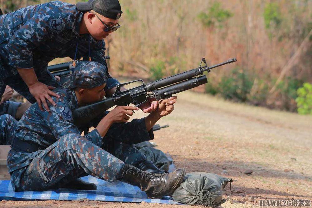 泰国空军士兵进行实弹射击训练时,出现了一支配备XM-148下挂榴弹发射器的M16步枪。这种榴弹发射器在越战时期少量装备美军特种部队进行测试,没想到至今还是泰国空军的制式装备。其尾部向后延长的击发杆,让射手可以不改变持枪姿势的前提下,就能发射40mm榴弹。