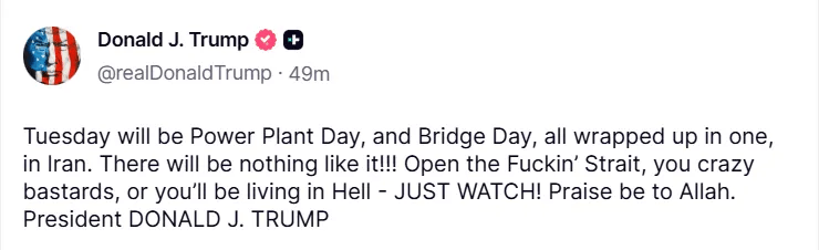 特朗普在社交媒体上发文说,“4月7日将是伊朗的发电厂日和大桥日”,暗示要猛烈轰炸伊朗的发电厂和大桥。他还说:“打开那个该死的海峡,否则你们将活在地狱中——走着瞧!” 特朗普甚至在帖文中爆出粗口,言语间情绪十分激动。