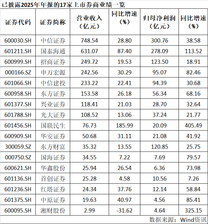 上市券商年报进入密集披露期,目前已有17家券商披露了2025年年报,仅1家券商营收下滑,所有券商净利均同比增长。